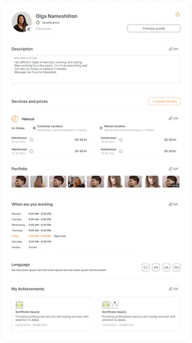 Заповніть профіль. Додайте опис, ціни, фото робіт та мову спілкування.